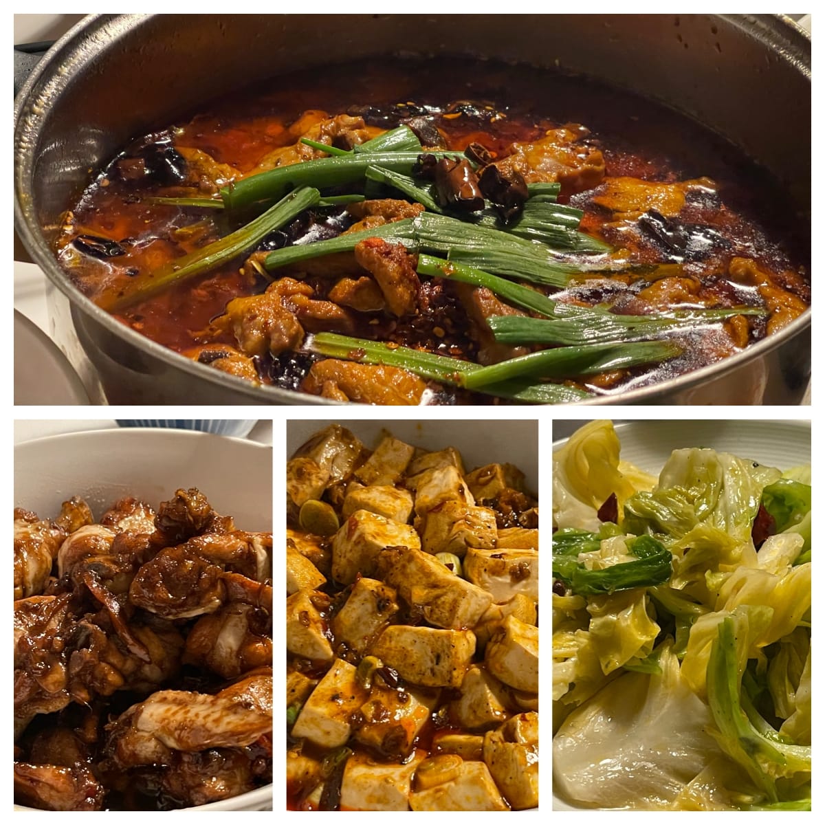 Down-Left: 可乐鸡翅(Coca-Cola Chiken Wings): Innovated Sichuan Dish. First, sauté various spices, and at the same time add brown sugar to caramelize. Then, add the chicken wings that have been blanched in water to the pot and stir-fry until the chicken skin is golden brown. Add Coca-Cola and simmer for 10 minutes, then uncover and continue to cook over low heat until the sauce thickens. During the reduction process, you need to turn the chicken wings 2-3 times to ensure that the flavor is evenly attached to the chicken wings.