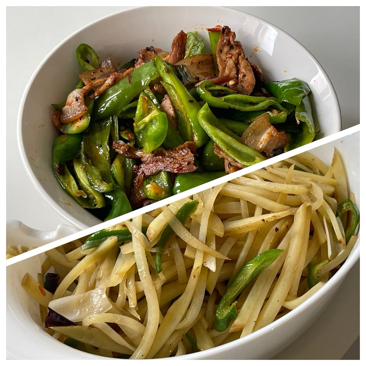 Down: 青椒土豆丝(Stir-fired Sliced Potato with Green Peppers, Qingjiao Tudousi) is a popular Chinese dish made with green peppers and potatoes. It is a simple dish to make, but it is full of flavor. The green peppers add a bit of heat and sweetness to the dish, while the potatoes add a bit of starch and crunch. The dish is typically made by first cutting the green peppers and potatoes into thin strips. Then, the vegetables are stir-fried in a pan with oil until they are tender. Finally, the dish is seasoned with salt, pepper, and other spices. Qingjiao Tudousi can be served as a main course or as a side dish. It is a versatile dish that can be enjoyed by people of all ages.