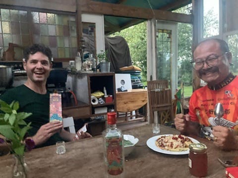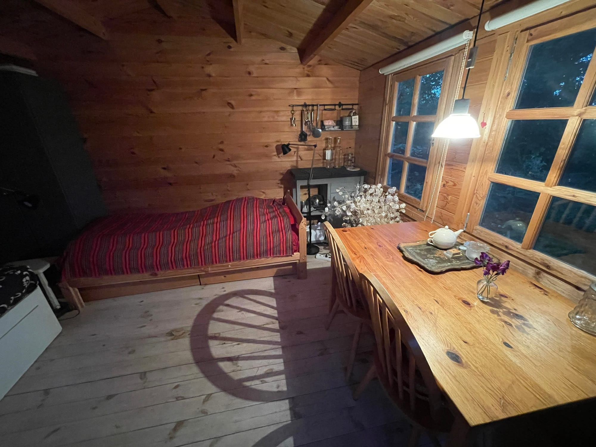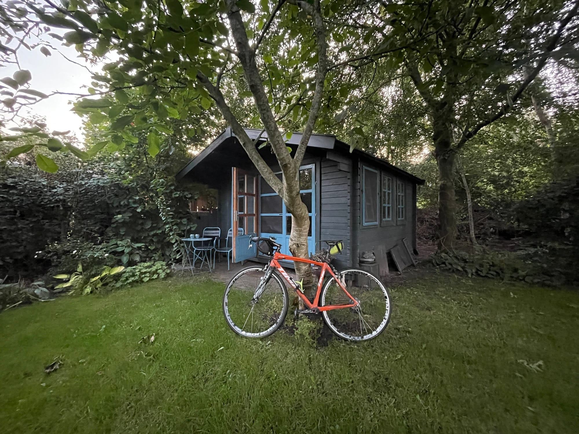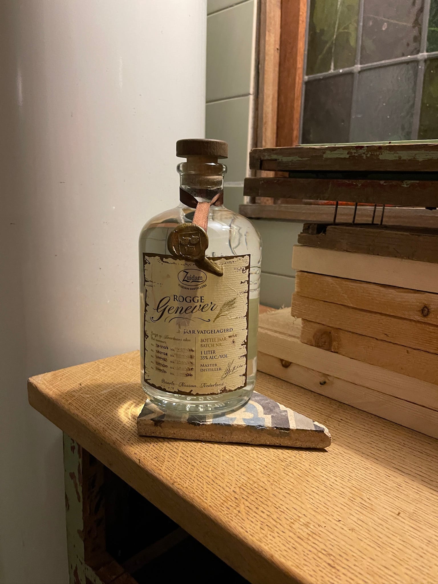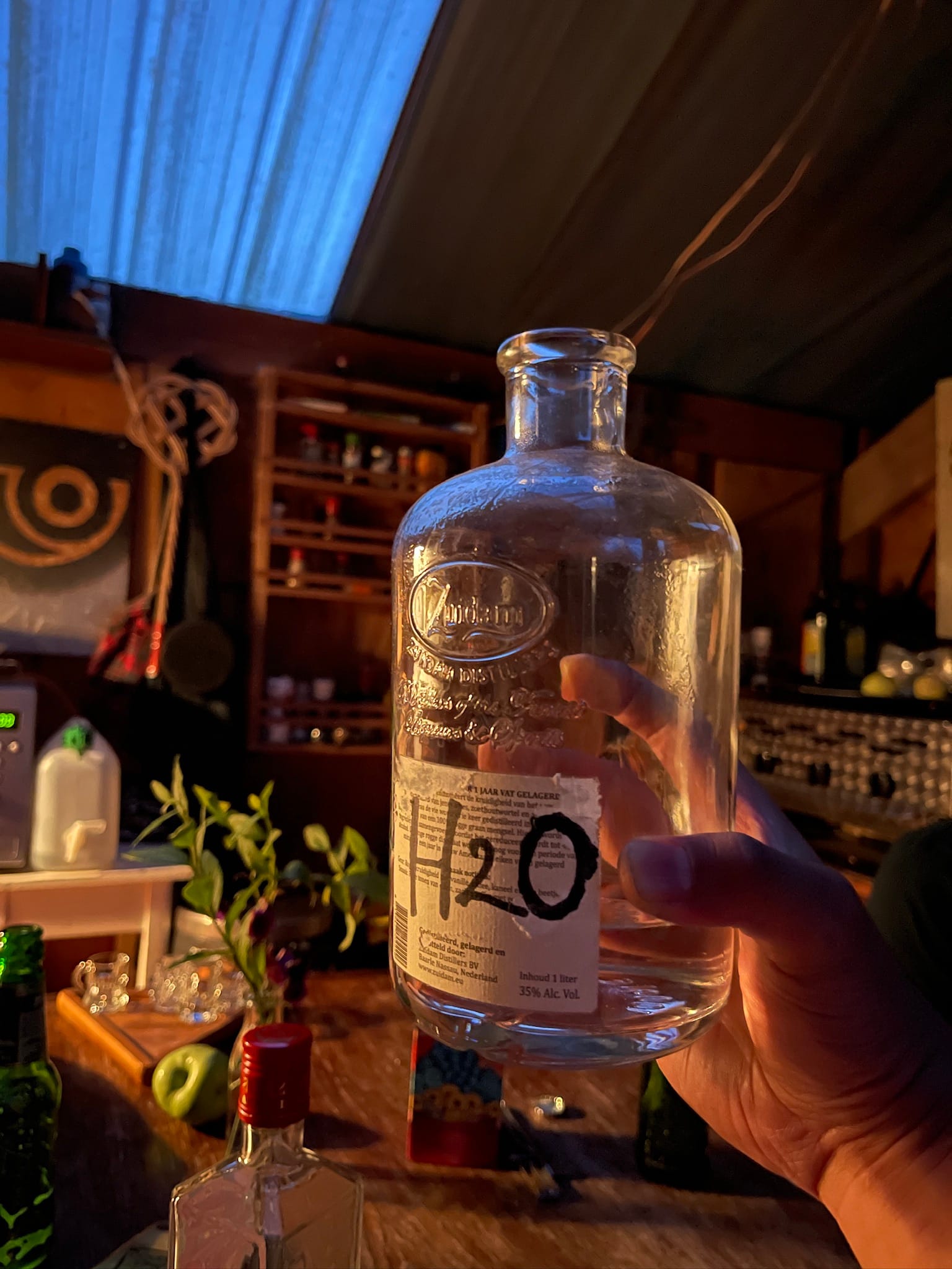 After eating, they settle me in a wood hut in the garden. I love it so much. Taking some notes, reflecting about conversations, then I go to bed. All the water bottles I see are Zuidam Jenever bottles.