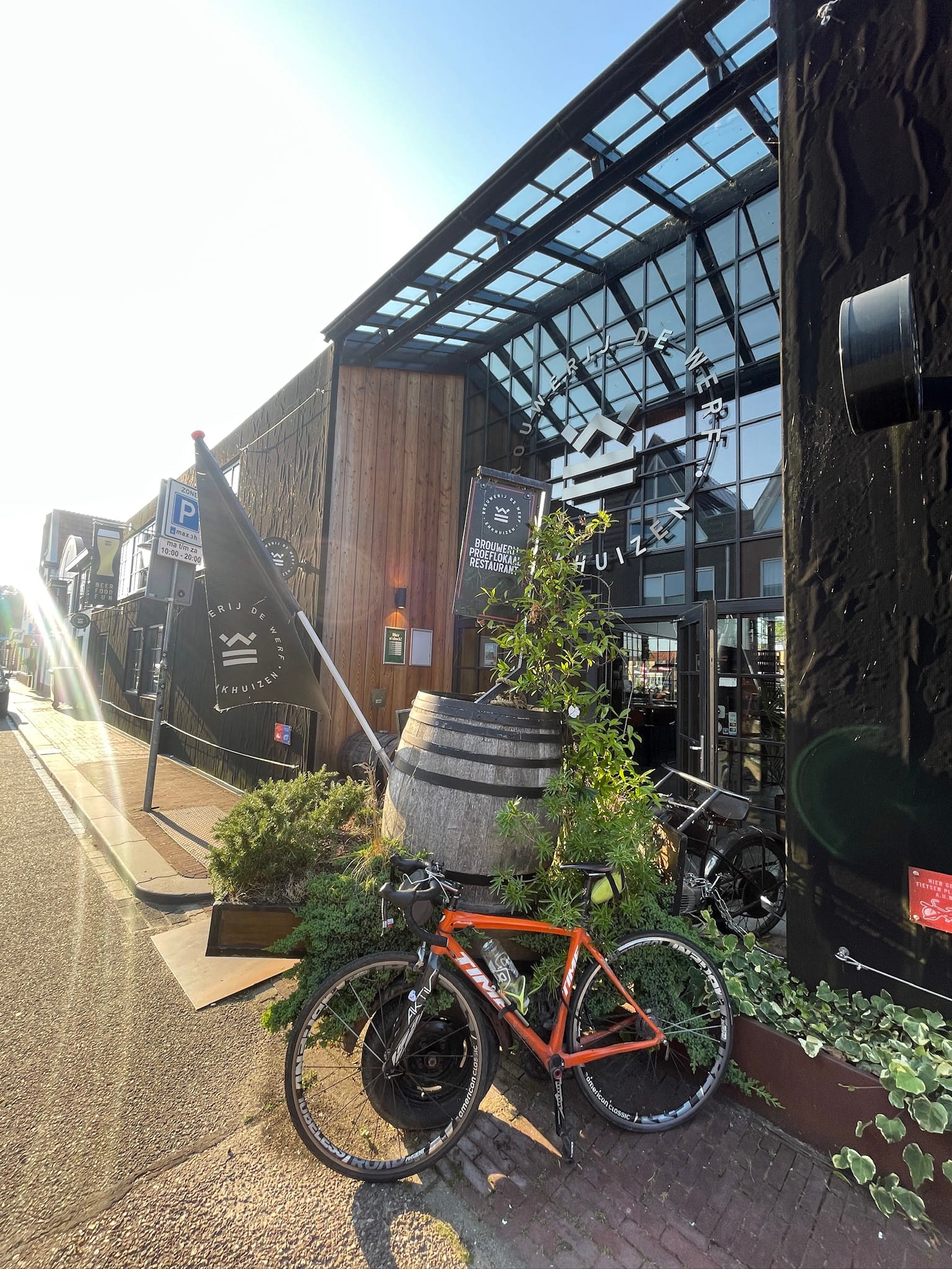 My rear tyre is leaking, and I have to pump it up every 20 kilometers. I pray not to have a flat tire in the middle of the lake, as it is hard to put the tire beads back into right position without soapy water and good air pump. The rear tire lasts till I reach Brouwerij de Werf, a beer brewery with a restaurant, and the terrace in the back is very nice.