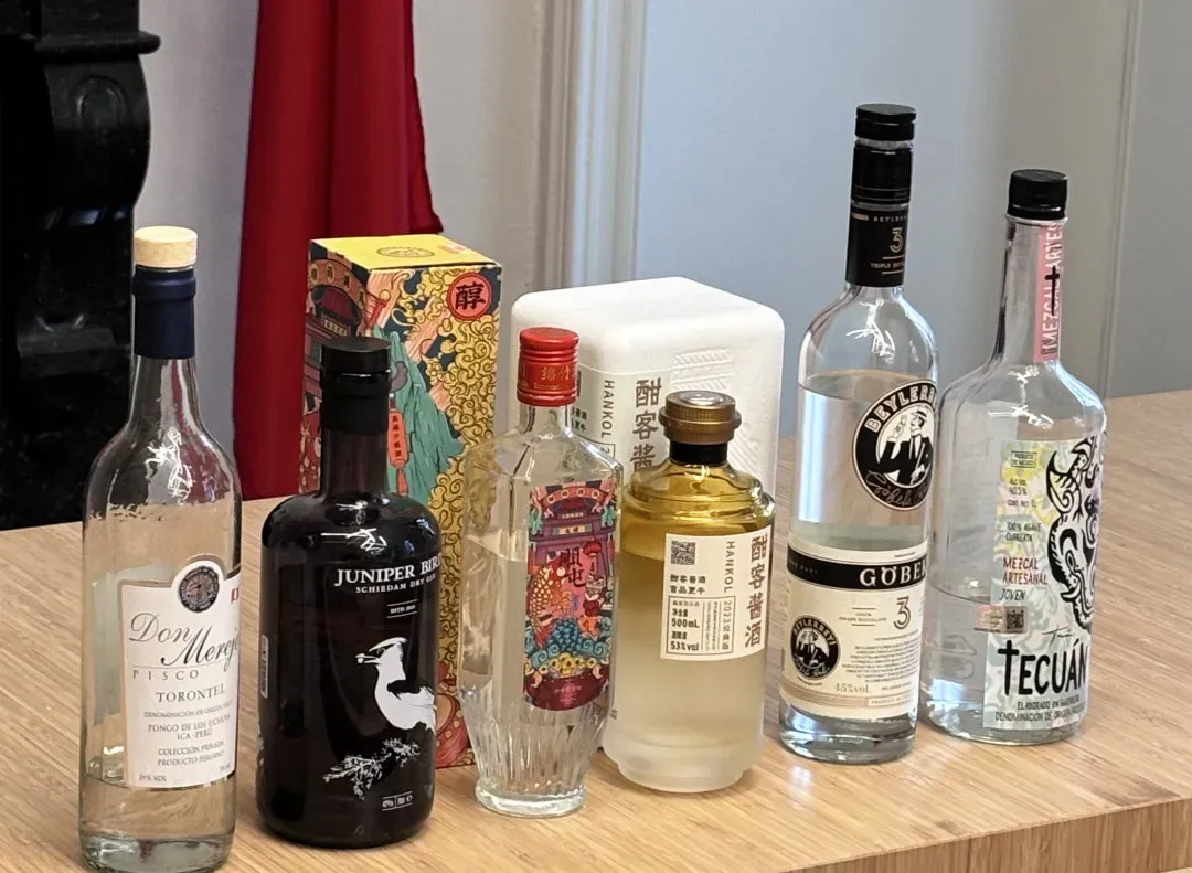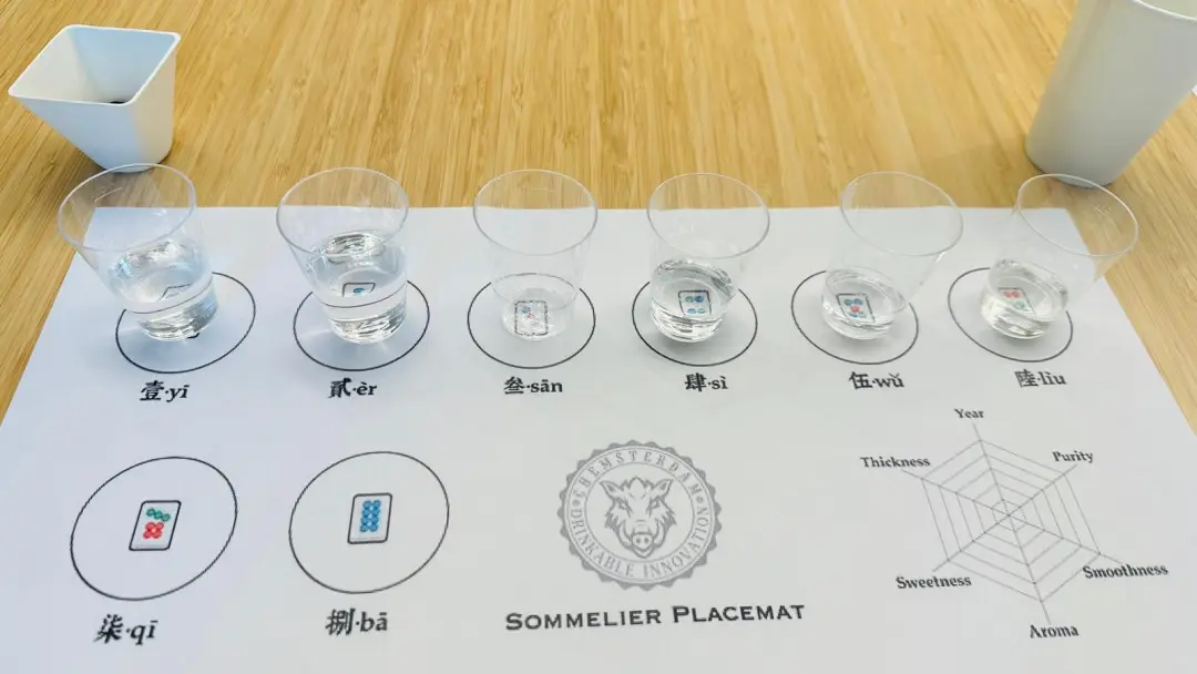 在本次活动的最大亮点——酒的品鉴环节中,伍先生悉心引领大家对甜香、陈皮肉桂八角香、茴香、烟熏、果香和酱香六款不同类型的烈酒进行了观色、闻香、浅尝,讲授这六款来自不同国家的酒背后的故事。值得一提的是伍先生以自己的家乡——四川成都著名的麻将元素为灵感设计了本次活动的桌垫,让整个品鉴活动充满浓浓的中国味儿。随着伍先生的讲授,大家一起仔细观察酒液的色泽与流动,轻嗅酒香中蕴含的丰富层次,细细品味着每一款酒所带来的独特口感与风味,仿佛穿越时空,置身于古老的酿酒工坊之中,感受着中华白酒文化的深厚底蕴与独特魅力。